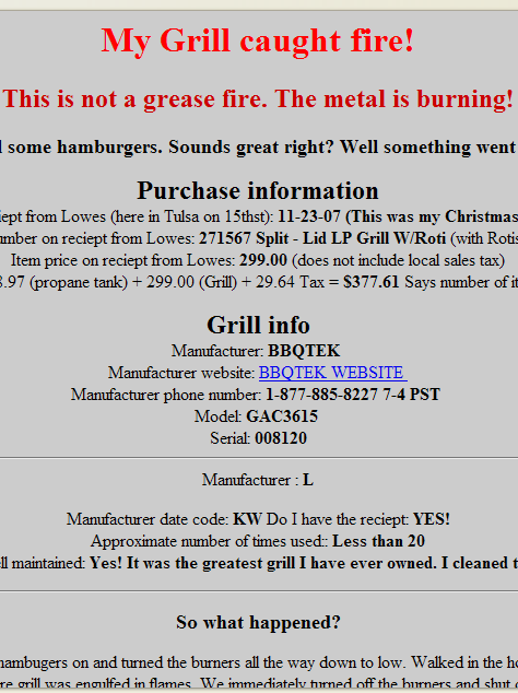Special Edition - Perfect Flame Grill Catches FireThe image below is a screenshot of a web page built by a man who had some very, very bad luck with a propane grill. He purchased the grill, a Perfect Flame model GAC3615, at a Lowes Home Improvement Center in Tulsa, OK on November 23, 2007, and evidently used it without problems until July 7th of this year.He lit the grill to preheat it, got it up to about 400 degrees, then went indoors to do some food preparation. He left the grill unattended for about 5 minutes, and when he returned, he found his grill engulfed in flames! It wasn't just a grease fire, the metal of the grill had actually ignited and was burning white-hot! Why am I sending out this Special Edition of the BlueSmoke Gazette? So you're aware of the problem this man claimed to have with his Perfect Flame grill, and if you have one of them, take appropriate action. I can't tell you what that action might be, but after you read his story, you can decide what, if anything, you should do if you have one of those grills. I'm very surprised that the metal parts of the grill actually caught on fire. I know that magnesium will burn, and it's possible that the aluminum contained a high percentage of the metal. It's reported that many owners of the grill experienced problems with the burners cracking while the grills were still fairly new. The grill was a product manufactured in China.