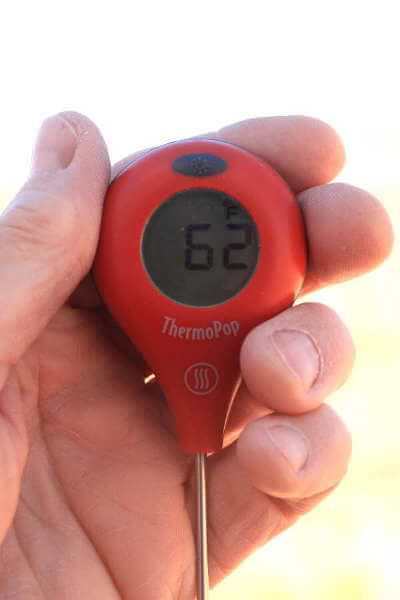 Submerging the probe tip into the brine let me know that it was still safely below 40˚ Fahrenheit.
